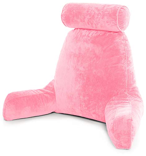 Husband Pillow - Pink, Big Backrest Reading Bed Rest Pillow with Arms, Plush Memory Foam Fill, Remove Neck Roll Off Bungee, Change Covers, Zipper On Shell of Bed Chair for Adjustable Loft