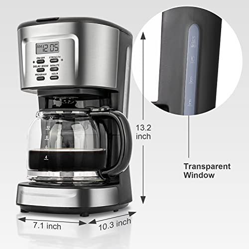12-Cup Programmable Coffee Maker, Electric Drip Coffee Machine with Glass Carafe & Warming Plate, Multiple Brew Strength, Kitchen Essentials, Stainless Steel & Black