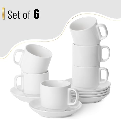 BTaT- Stackable Tea Cups and Saucers, Set of 6 (8 oz), Cappuccino Cups, Coffee Cups, White Tea Cup Set, British Coffee Cups, Porcelain Tea Set, Latte Cups.