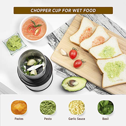 - 【GRIND & CHOP IN ONE GRINDER】Come with two detechable stainless steel bowls,grinder bowl for grinding coffee bean,legume,nutmeg,spice,flaxseed and peppercorns ect,chopper cup for garlic,herb,onion,basil and chili ect.Add appropriate water or oil into chopper bowl to enhance taste if need.