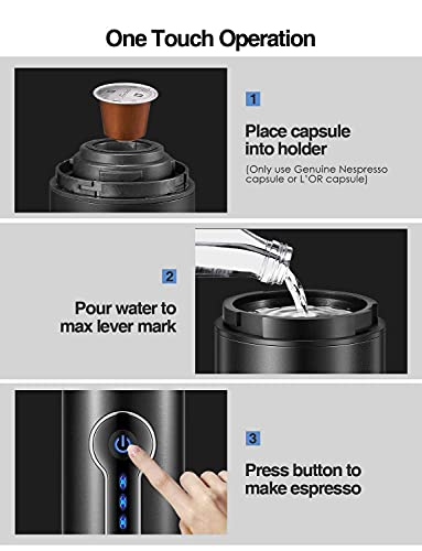 - 【Electric brewing espresso】Electric Portable Espresso Machine:when using hot water, after pressing the button for 5 seconds, you can get the aromatic coffee. When using cold water, press the button for 2 seconds to start heating and enjoy coffee in about 8 to 12 minutes.Up to 15 bar high-pressure pump allows for a barista-style result, unlocking the delicate flavor and premium aromas of coffee capsule during the brewing process.