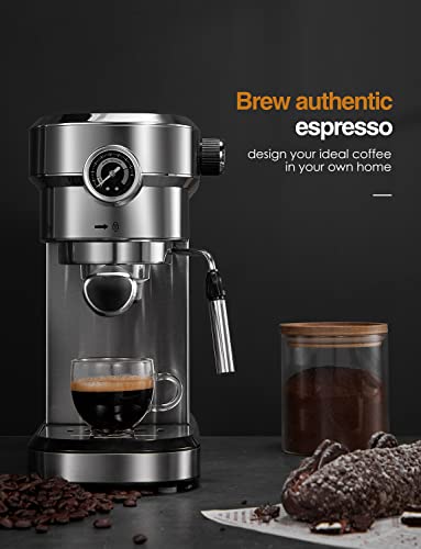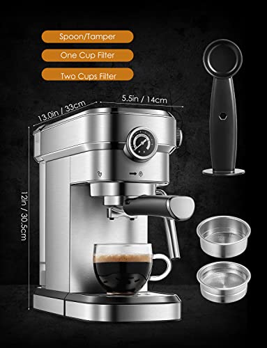 Espresso Machine, 15 Bar Espresso and Cappuccino Maker with Milk Frother Wand, Built in Pressure Gauge, Double Temperature Control, Brushed Stainless Steel, Professional Espresso Coffee Machine for Cappuccino and Latte