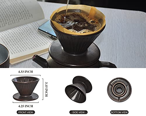 - STURDY, DURABLE and SUPERIOR QUALITY: Exquisite handmade pour over ceramic coffee hand drip feels good and more natural, matte finish and well made, unique rusty chocolate brown mineral glaze with ridges texture presents each dripper outstanding and overwhelming in appearance, lifetime promise never fade. Lead & cadmium free, non-toxic, don’t worry pouring hot water over fine ceramic day in and day out. Food-safe and healthy for daily use, care for your coffee time.