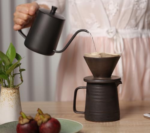 Globe Faith Handmade Pour Over Coffee Maker Set, Ceramic Pourover Coffee Dripper and Decanter, Pottery V60 Coffee Filter Drip Brewer and Coffee Pot, Stoneware Eco-friendly Coffeemaker Percolator, Annular Vein Retro Metallic Black Glaze 16oz Prices