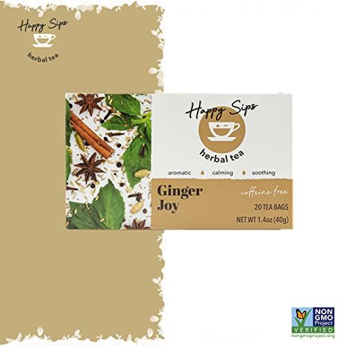 Happy Sips Herbal Tea – Ginger Joy – Made of 11 Non-GMO Natural Herbs & Spices with No Artificial Flavor, Colors, or Additives | 100% Naturally Caffeine Free | Aid in Digestion | 20 Individually Wrapped Tea Bags (Pack of 1)