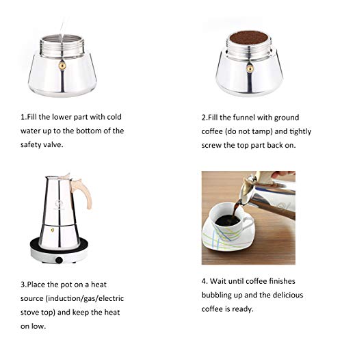 - ★GOOD MATERIAL: Premium construction, made of high quality food grade stainless steel for longer life than aluminum, has strong anti-corrosion and rust resistance. Elegant espresso maker body through polishing design, safety pressure release valve to make your use process more secure.