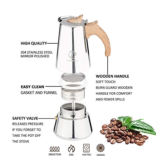 Pengrui Stainless Steel Stovetop Coffee Maker,6 Cup Moka Espresso Maker,Induction Suitable Italian Coffee Maker Percolator,Soft Touch Wooden Handle Moka Pot Prices