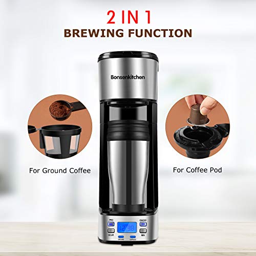 - 【2-IN 1-BREWING FUNCTION】No more debate whether make a coffee with coffee pods or coffee ground. Selet the mode, this personal single serve coffee maker will give you thae fresh, pure taste that is required to jump start your day.